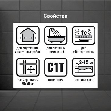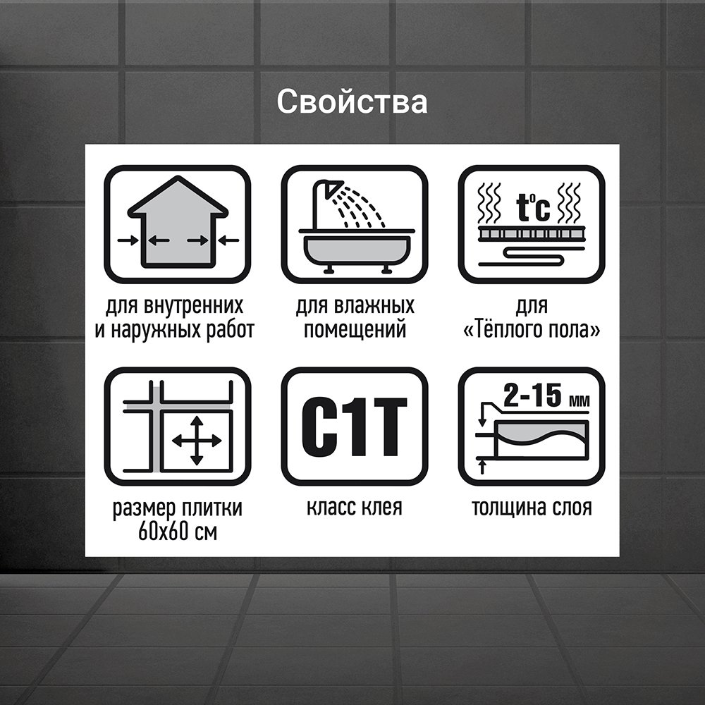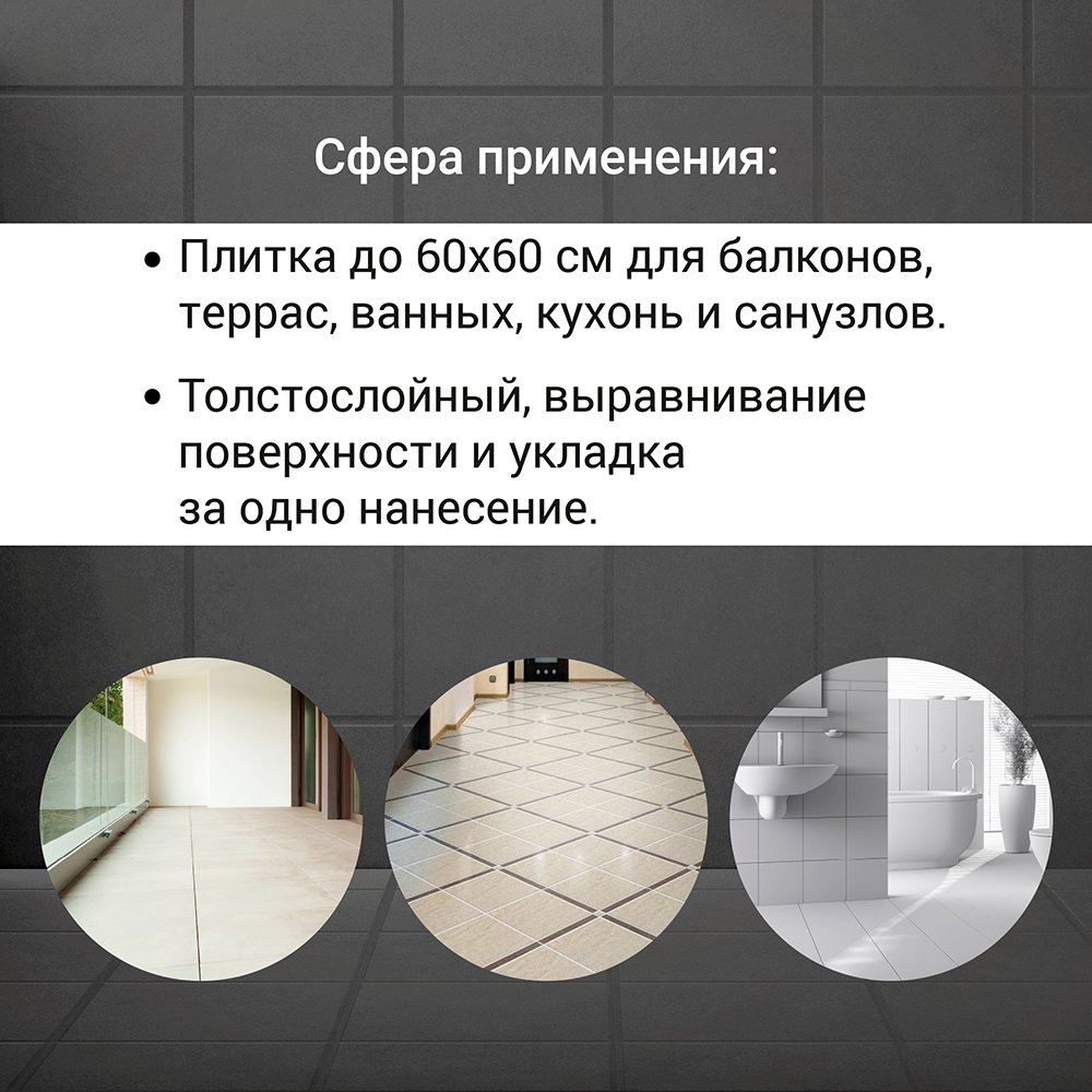2 в 1: клеит и выравнивает перепады до 15 мм Для керамической плитки Устойчив к сползанию 24 часа до хождения Прочность сцепления до 1 МПа