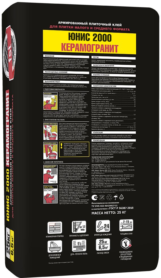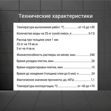 Температура выполнения работот +5...+30°С Количество воды на 25 кг. сухой смеси5,0-7,5 л Толщина слоя2-15 мм Расход при слое 1 мм1,25-1,35 кг/м² Жизнеспособность раствора, до180 минут Время укладки плитки10 минут Время корректировки плитки10 минут Прочность клеевого соединения в воздушно-сухой среде, до, МПа1 Время до хождения (толщина слоя до 6 мм)24 часа Затирание швов на стенах (при использовании зубчатого шпателя с размером зуба 3х3 мм.) не ранее8 часов Варианты фасовки5; 23; 25 кг Срок хранения12 месяцев