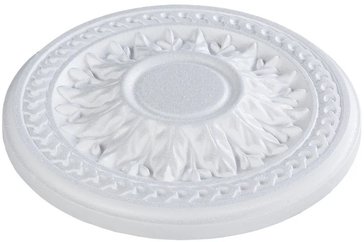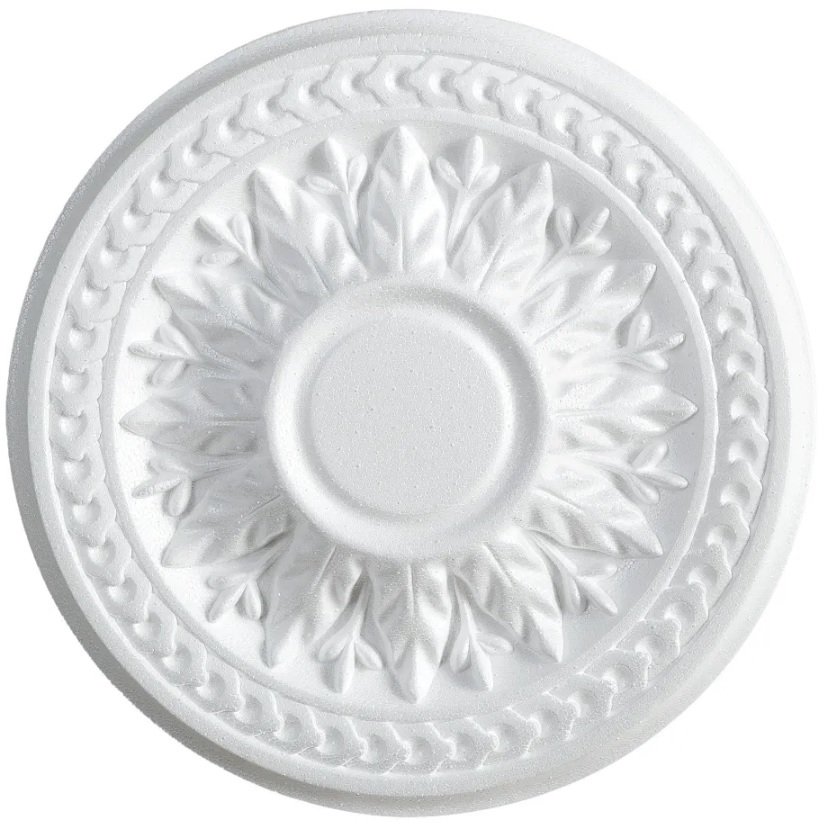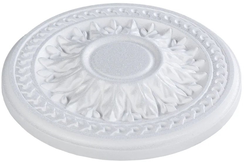 Изготовлена из прочного полистирола. Легко крепится на клей или саморезы к потолку после установки крюка или планки для люстры.