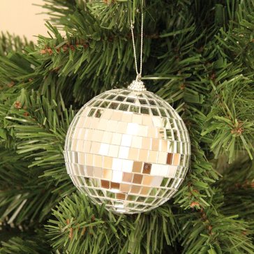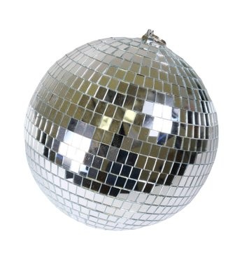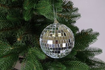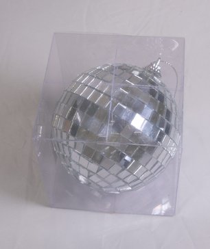 Шар оформлен небольшими зеркальными элементами, которые эффектно преломляют свет прожекторов или гирлянд и наполняют помещение необычными цветными бликами.