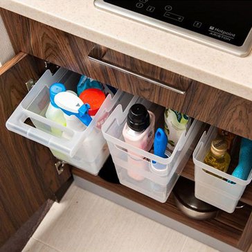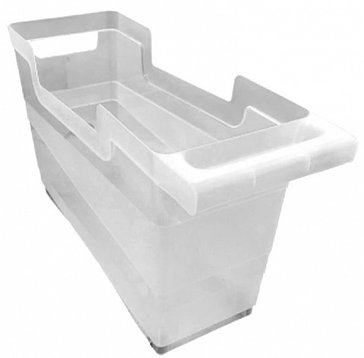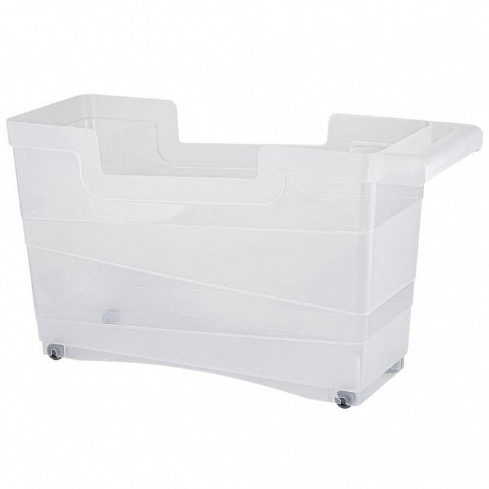 Контейнер хозяйственный универсальный для хранения кухонных аксессуаров, инструментов, бытовой химии и пр. На лицевой стороне предусмотрена удобная ручка для комфортного и легкого выдвижения и постановки на полку. Контейнер оснащен маленькими колесиками.