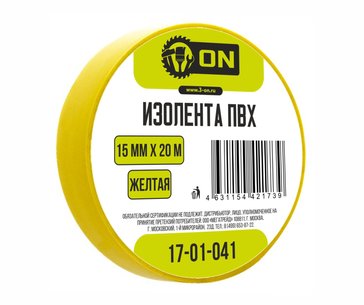 Лента изоляционная ПВХ 15мм х 20м желтая ON - на поливинилхлоридной основе с добавлением различных веществ для повышения прочности и устойчивости неблагоприятным воздействиям окружающей среды.