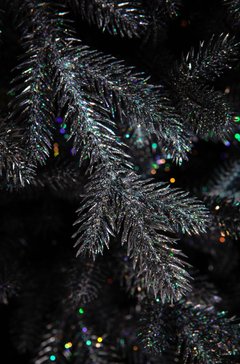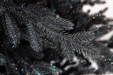эффектная елка оригинального дизайна, с густой пышной кроной, хвоя черного цвета с блестками