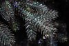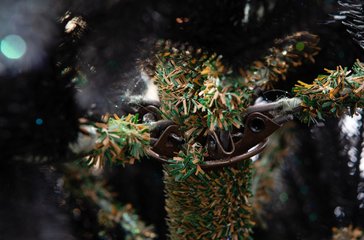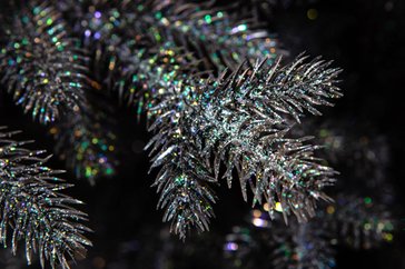 – У нее 100% литые ветки черного цвета на которых нанесена мелкая глитерная крошка. За счет чего, ель меняет свой оттенок в зависимости от цвета украшений и цвета гирлянды на еле и цвета ламп гирлянды и может быть, черной, серой, зеленоватой. Для нее подходит много оттенков, но особено красиво смотрится золото, серебро, белый
