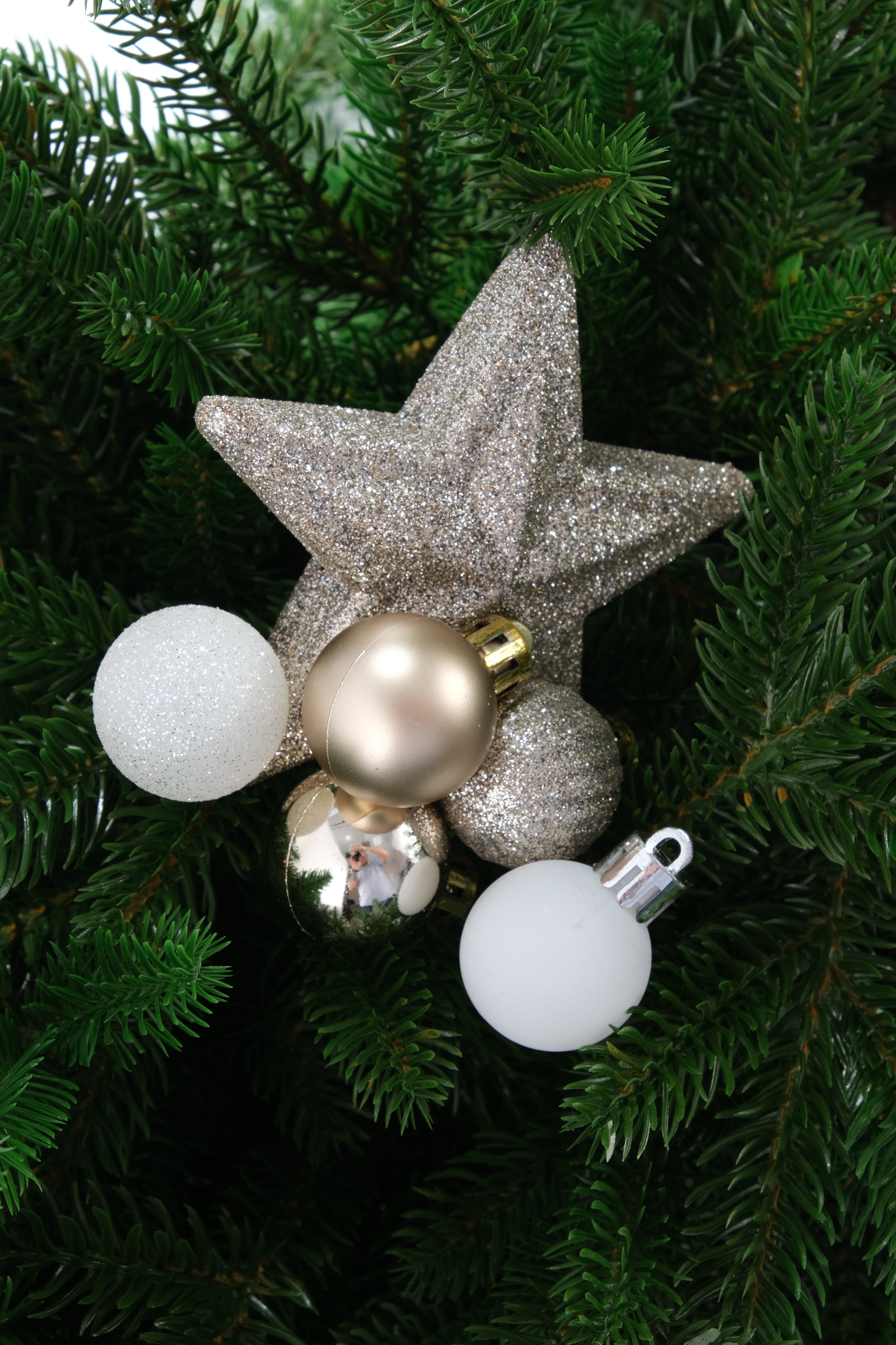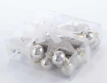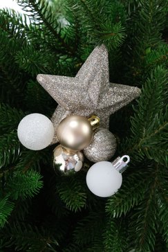 Чтобы декорировать елочку модно и элегантно, подвески на ней должны сочетаться между собой и с убранством комнаты. Важно не просто развесить свой "клад", но и хорошо продумать, где поместить ту или иную деталь. Один из самых простых способов решения этой задачи - выбрать елочные украшения одной цветовой гаммы. В этом вам поможет набор украшений из 30 предметов в бело золотой расцветке, который сделает украшение вашей новогодней елки еще более привлекательным.