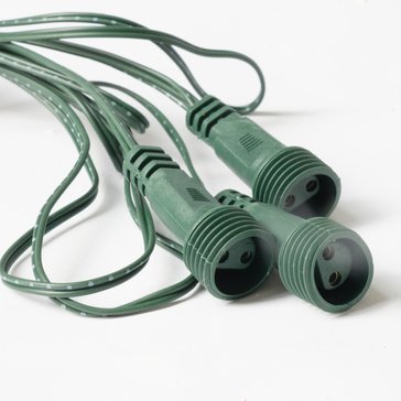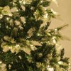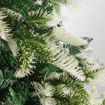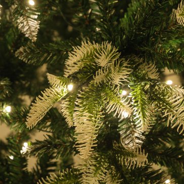 зеленая елка с заснеженными кончиками веточек, с вплетенной LED-гирляндой, теплый белый свет