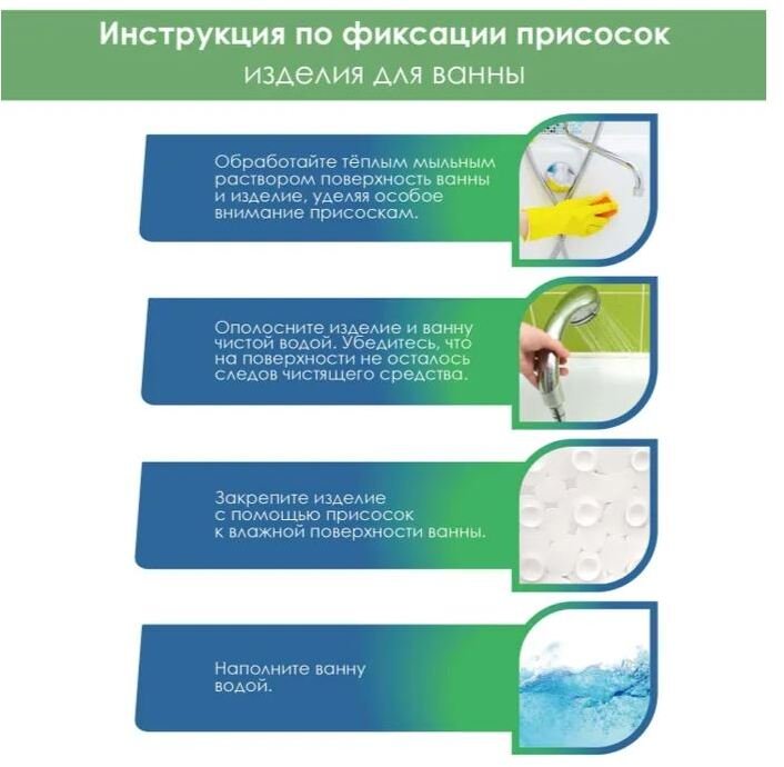 Коврики просты в эксплуатации, легко очищаются обычной водой. При необходимости, его можно достать из ванной и просушить (качество наших присосок позволяет многократное использование).