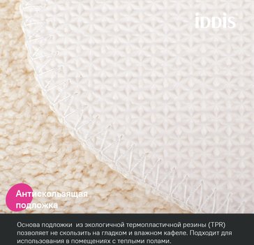 • Этот коврик в ванную противоскользящий: основа из экологичной термопластичной резины (TPR) позволяет не скользить на гладком и влажном кафеле. Подходит для использования в помещениях с теплыми полами.