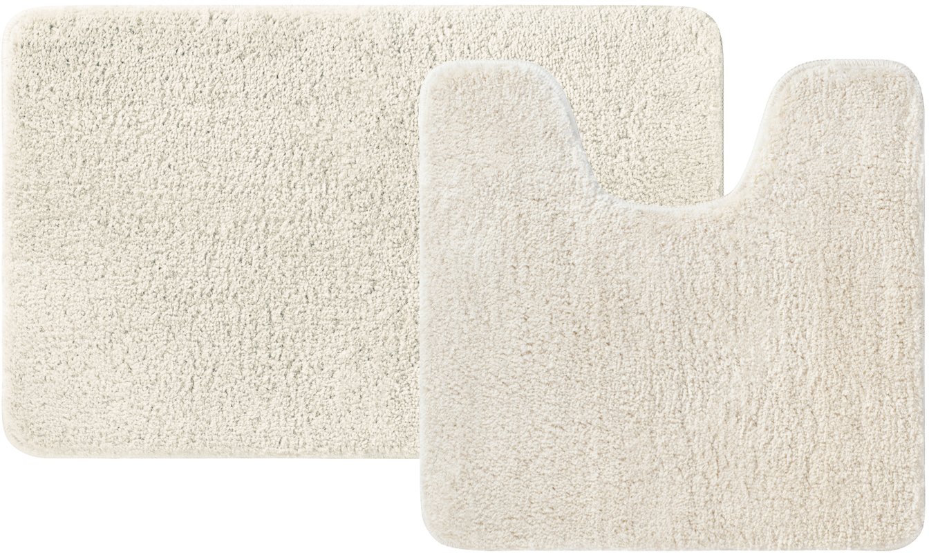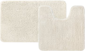 Набор из двух мягких ковриков для ванной теплого бежевого цвета с плотным высоким ворсом (2 см), очень приятных на ощупь. Стриженый ворс из микрофибры отлично держит форму, легко чистится и быстро сохнет. Коврики предназначены для ванной и для туалета (маленький коврик имеет вырез под унитаз).