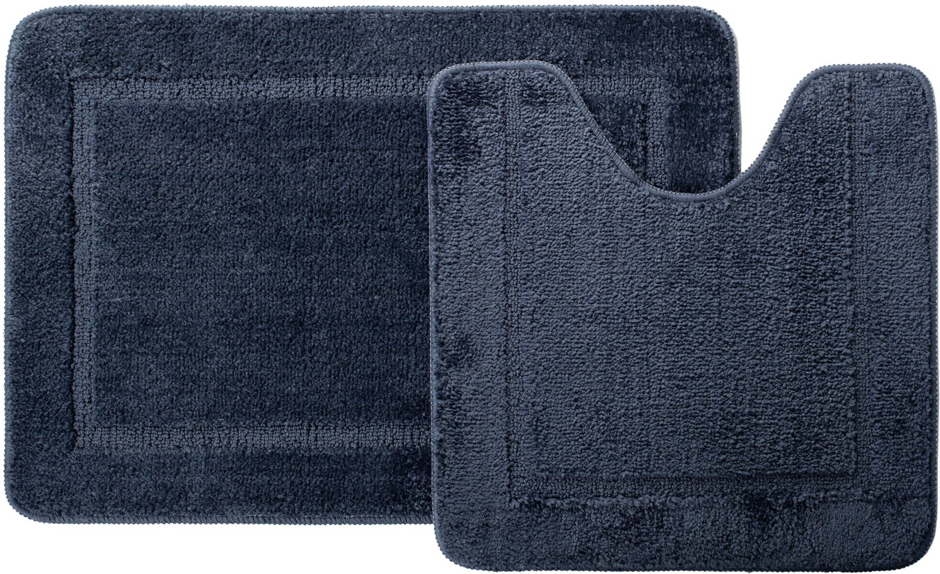 Набор из двух мягких ковриков для ванной глубокого синего цвета с плотным невысоким ворсом (1 см), очень приятных на ощупь. Ворс из микрофибры отлично держит форму, легко чистится и быстро сохнет. Коврики предназначены для ванной и для туалета (маленький коврик имеет вырез под унитаз).