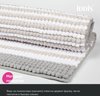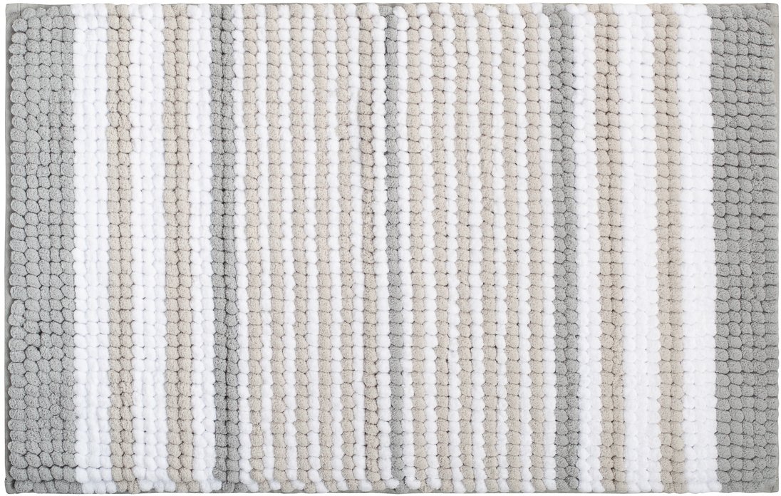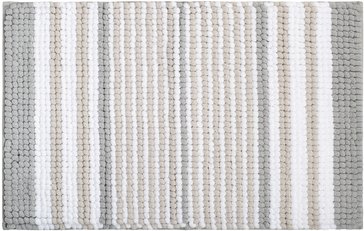Коврик для ванной комнаты с узором в виде полос универсального светло-серого цвета в сочетании с белым и бежевым поможет сделать ее уютной и теплой. Коврик приятный и мягкий на ощупь, имеет массажный эффект. Крупный и плотный петельчатый ворс из полиэстера легко чистится и быстро сохнет. Коврик подойдет для ванной и туалета.