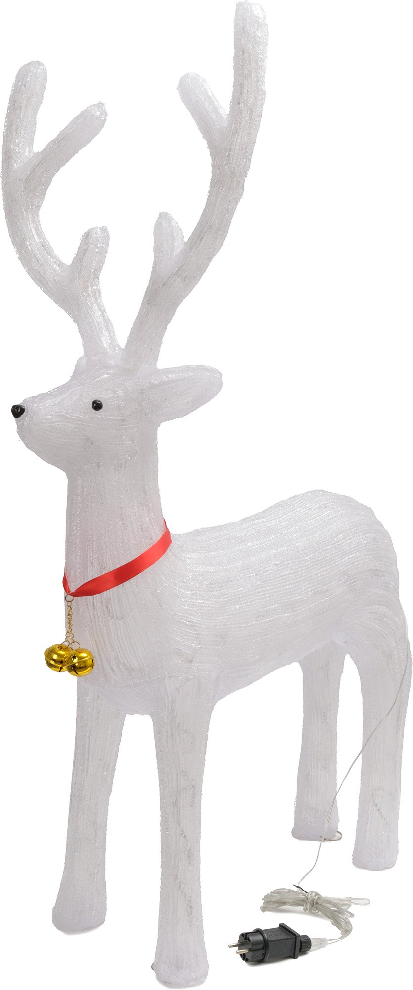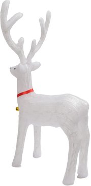 Олень имеет размеры 110 см и состоит из 176 ярких светодиодов, которые обеспечивают равномерное и яркое освещение. Степень защиты IP44 гарантирует надёжную работу даже при попадании брызг воды, что делает эту фигуру идеальной для использования как внутри помещения, так и снаружи. Холодный белый свет придаёт особую магию и уют.