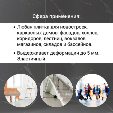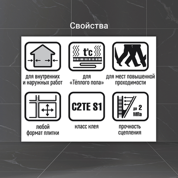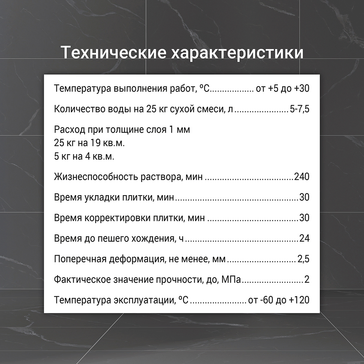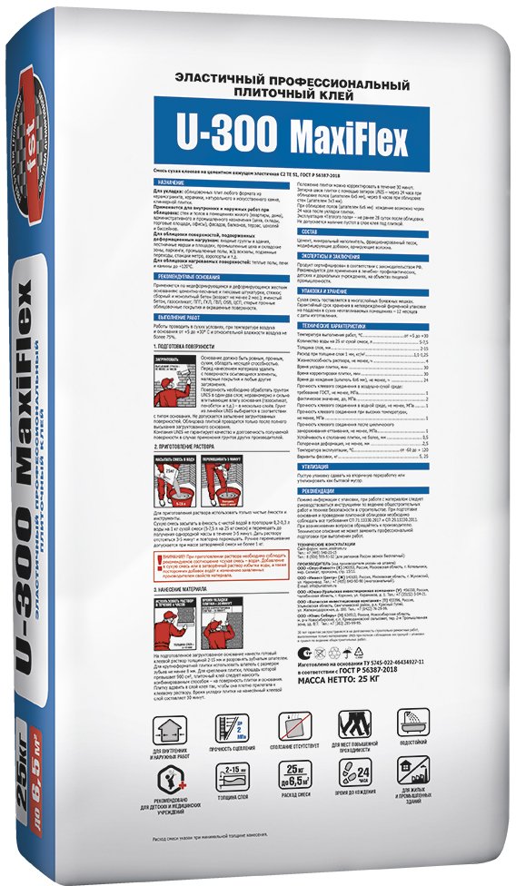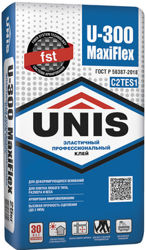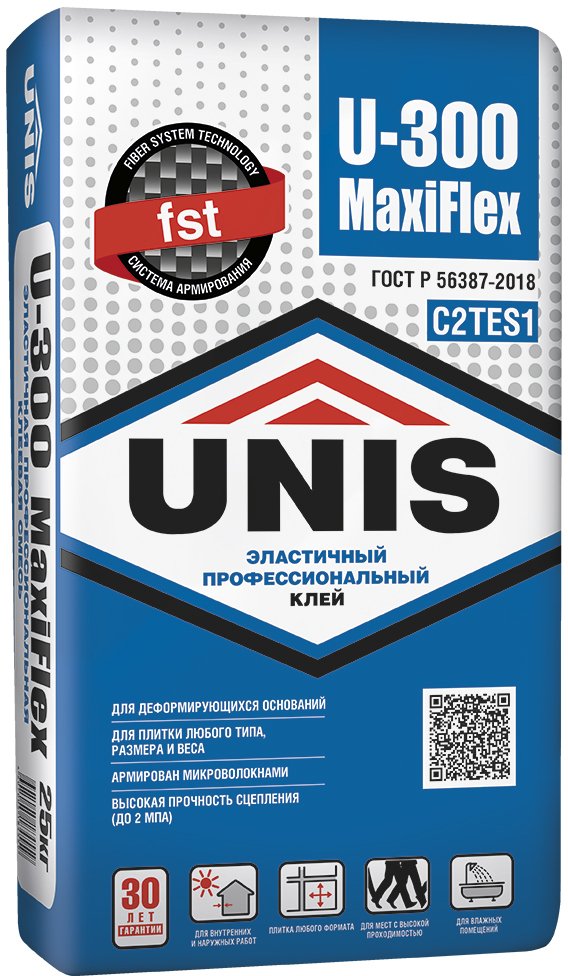 Клей для плитки Unis U-300 Maxiflex C2TES1 — высококачественный армированный состав, разработанный для укладки керамогранита, натурального и искусственного камня, керамической и клинкерной плитки. Подходит для внутренних и наружных работ на стенах и полах, включая облицовку фасадов, балконов, террас, цоколей и бассейнов. Клей обладает классом прочности C2 TE S1, повышенной вибростойкостью и ударопрочностью, что делает его идеальным для поверхностей, подверженных нагрузкам: промышленных зон, паркингов, вокзалов и метро. Устойчив к температурным перепадам и выдерживает до +120 °C, что позволяет использовать его для теплых полов, каминов и печей. Особенности: - Состав: цемент, минеральный наполнитель, модифицирующие добавки, фракционированный песок. - Температура применения: от +5 до +30 °С. - Соотношение воды: 5–7,5 л на 25 кг смеси. - Толщина слоя: 2–15 мм. - Расход при слое 1 мм: 1,1–1,25 кг/м². - Время жизни раствора: не менее 4 часов. - Время укладки и корректировки плитки: 30 минут. - Прочность сцепления в различных условиях: до 1,8 МПа. - Устойчивость к сползанию: до 0,5 мм. - Рабочая температура: от -60 °С до +120 °С. - Вес: 25 кг. Клей обеспечивает надежное и долговечное крепление даже на сложных поверхностях, что делает его универсальным выбором для профессионального применения.