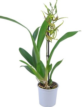 Полив орхидеи Брассия производится путём погружения горшка в ёмкость с водой на 15–30 минут. После этого необходимо убедиться, что все излишки воды удалены, и только затем вернуть растение на место. Пересадку рекомендуется производить раз в 2 года, выбирая горшок на 4 см больше в диаметре.