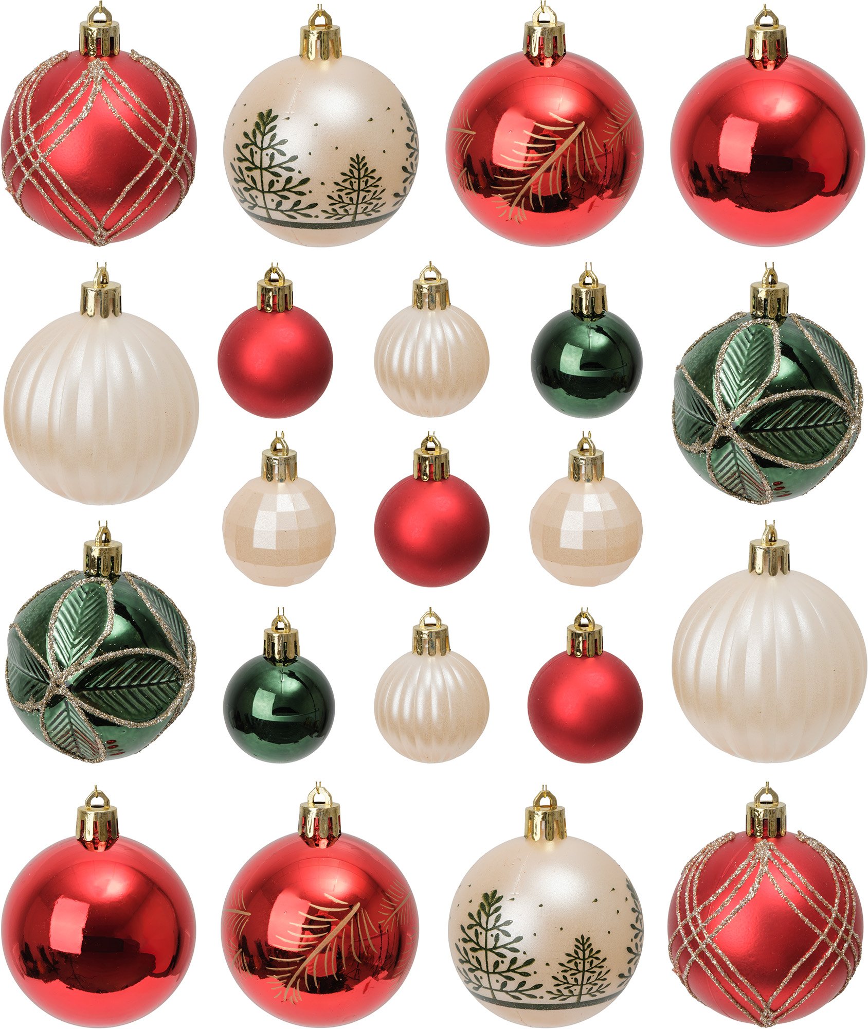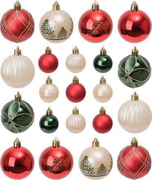 Представьте: ваша ёлка, украшенная сочными красными, свежими белыми и глубокими зелёными шарами. Игра контрастов и гармоничное сочетание цветов создают атмосферу настоящего зимнего праздника. Крупные шары (4–6 см) отлично видны с любого ракурса, а продуманная цветовая гамма позволяет оформить ёлку в классическом новогоднем стиле без лишних усилий.
