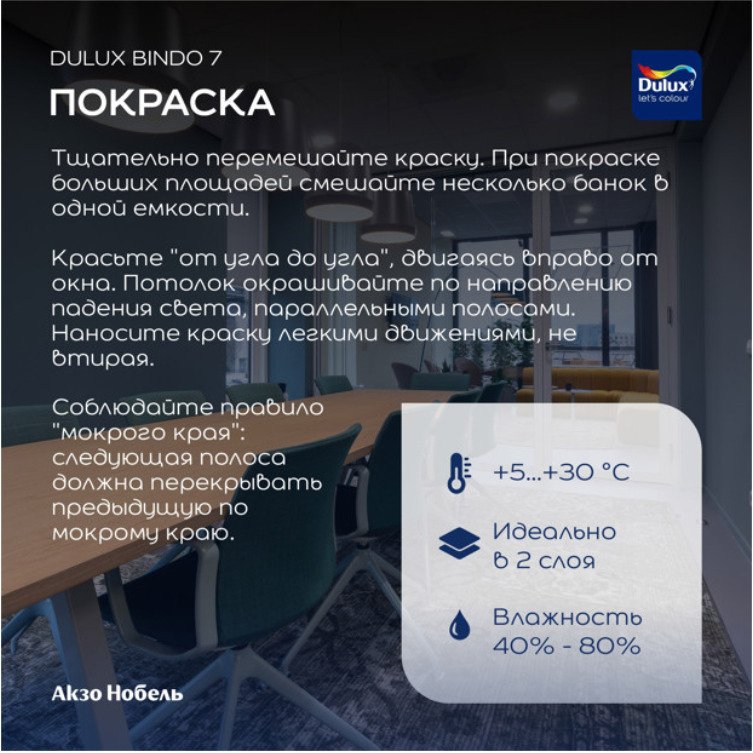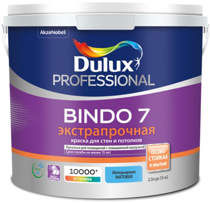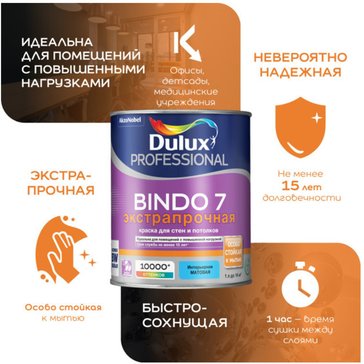 -21%Экстрапрочная матовая водно-дисперсионная краска для высококачественной отделки стен и потолков в помещениях с высокой эксплуатационной нагрузкой, таких как гостиные, коридоры, офисы, детские сады, школы, медицинские учреждения и др. Тиксотропная: наносится без брызг и потеков, легко разравнивается; с нейтральным запахом. Область применения: Для окраски стен и потолков в помещениях с умеренной влажностью и повышенной эксплуатационной нагрузкой. Наносите на полностью просохшие минеральные поверхности (бетон, штукатурка, кирпич и т.п.), гипсокартон, обои под покраску, деревянные поверхности, ДВП. Заявленные свойства краски зависят от выбранного типа обоев. Рекомендована для применения в детских и лечебно-профилактических учреждениях. Особенности применения: Перед применением тщательно перемешайте. Для укрепления базовой поверхности, повышения адгезии и уменьшения расхода краски загрунтуйте подготовленную поверхность грунтовкой Dulux Bindo Base. Краску рекомендуется наносить в 2 слоя при температуре воздуха и поверхности +5…+30 °С и влажности воздуха от 40 до 80%. Разбавление: При необходимости не более 1 части воды на 10 частей краски.