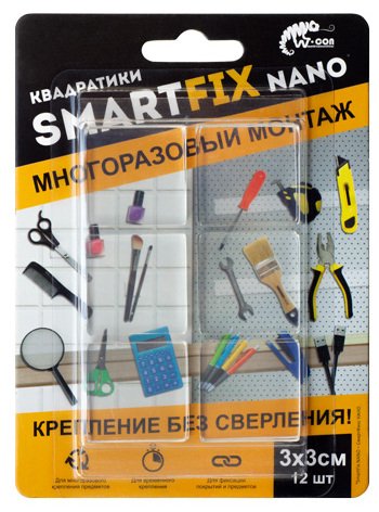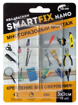 Квадратики для многоразового монтажа SmartFix Nano приклеиваются к большинству гладких чистых поверхностей! Могут переклеиваться повторно, их можно мыть в случае загрязнения. Квадратики не повредят стены и легко снимаются после использования, не оставляя следов.