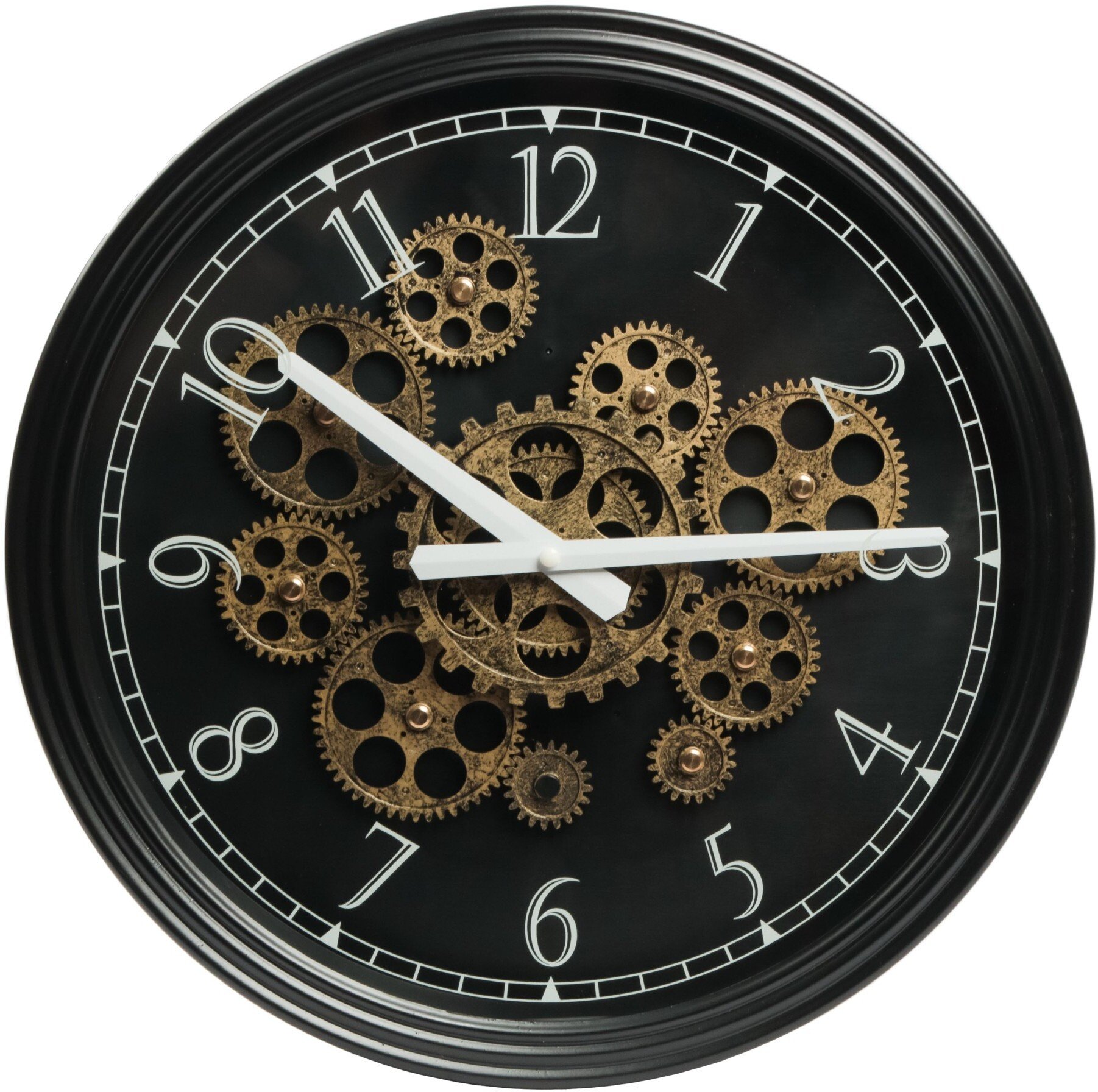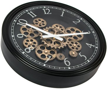 Часы настенные круглые "Шестеренки", с крутящимися шестеренками, цвет: циферблат - черный, шестеренки - золотой, диаметр - 38,5см, материал - металл, стекло, пластик, DMR-CHS-NST-0246