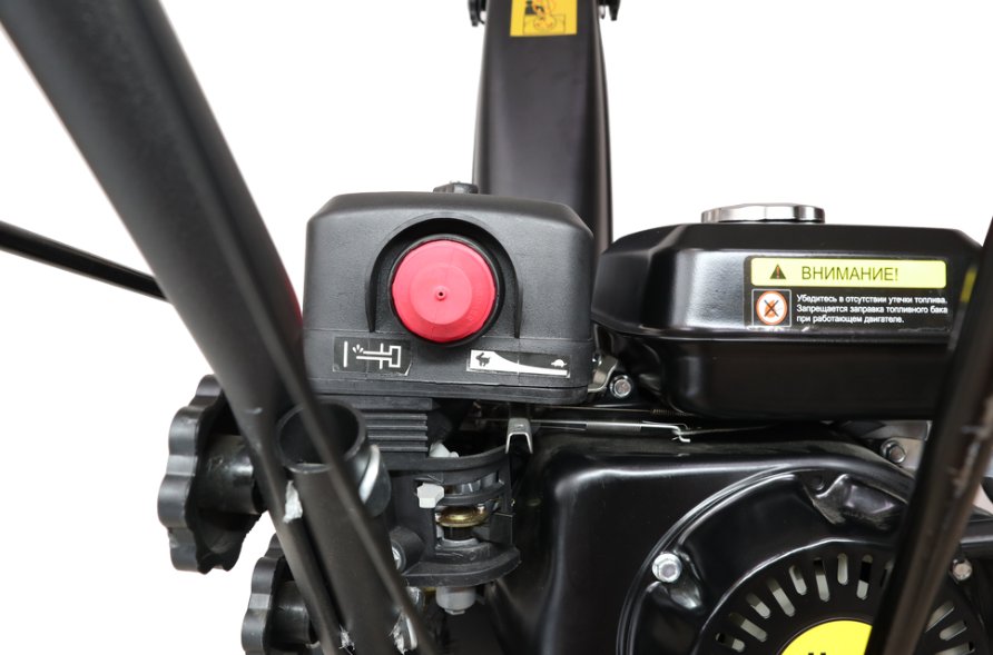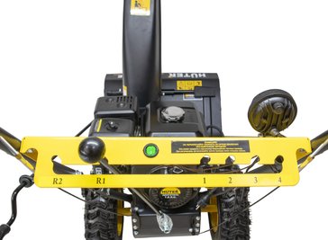 Все управляющие функции расположены в районе рукоятки. В процессе движения можно менять направление и высоту выброса снега.
