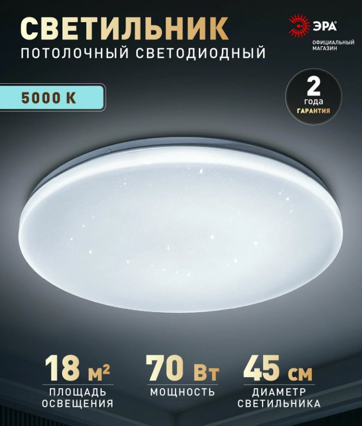 Светодиодный светильник ЭРА SPB-6 Slim Night SKY 70W-5K– современное решение для общего освещения жилых и коммерческих помещений. Компактные размеры 450×55 мм позволяют использовать его в сухих пространствах (степень защиты IP20) с низкими потолками, а универсальный дизайн сочетается со многими интерьерными стилями. Мощность светильника 70 Вт, а световой поток – 5300 лм. Матовый рассеиватель обеспечивает равномерное распределение света без бликов и дискомфорта для глаз. Цветовая температура 5000 К создаёт комфортные условия для работы и отдыха, рекомендуемая площадь освещения – 18 м². Встроенные светодиоды отличаются низким энергопотреблением, сроком службы до 30 000 часов и стабильным свечением без мерцания. Светильник легко монтируется, не требует обслуживания и может использоваться как основное или дополнительное освещение. ЭРА SPB-6 Slim Night SKY сочетает в себе современный дизайн, надежность и экономичность, что делает его практичным решением для квартир, офисов, торговых и вспомогательных помещений.