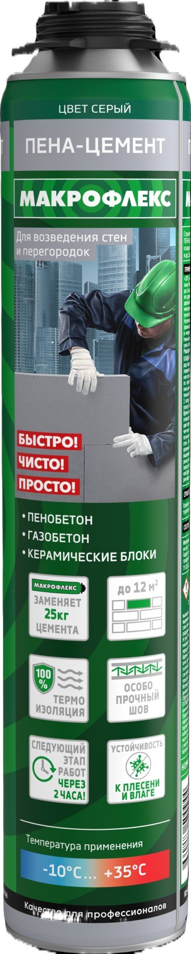 Готовый к применению твердеющий под воздействием влаги сверхэффективный инструмент для быстрого возведения стен-перегородок из строительных блоков и повышения производительности труда. Благодаря этому инновационному продукту больше не понадобятся тяжелые мешки, дополнительное оборудование, вода и энергия; больше не будет пыли и грязи, длительной работы по очистке и других поглощающих время работ. Пена-цемент позволяет выполнить работу значительно меньшими усилиями и помогает вдвое сократить затрачиваемое на работу время.