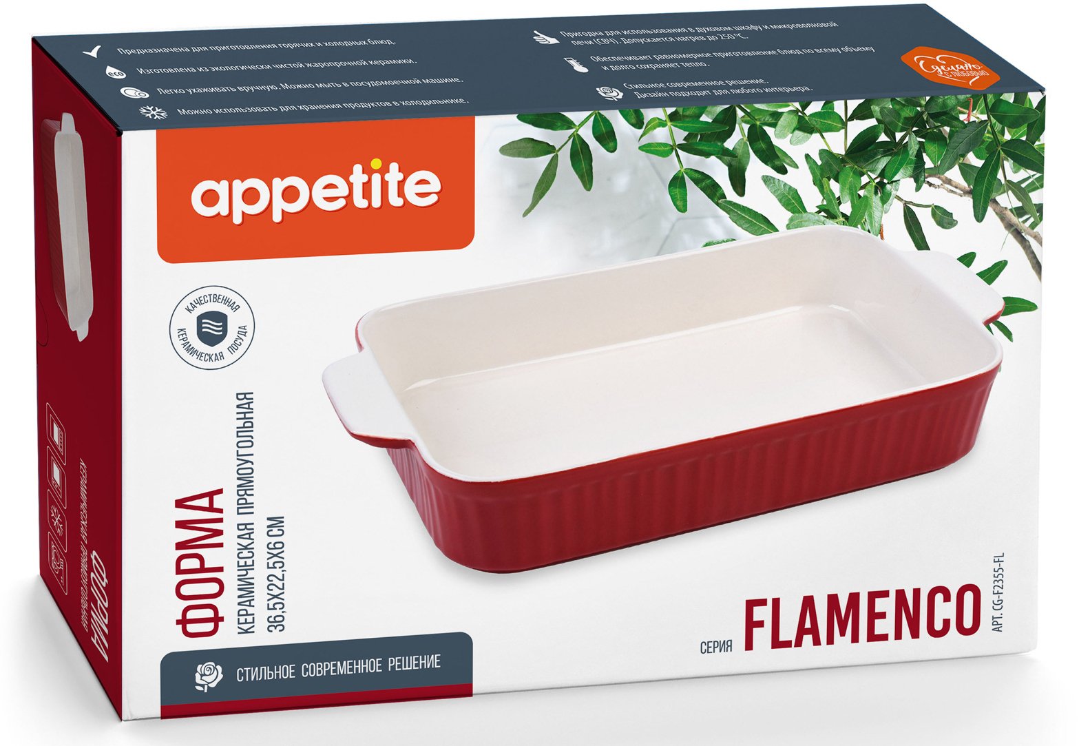 Откройте мир безупречного запекания с керамической формой Appetite Flamenco! Прямоугольный силуэт размером 36,5х22,5х6см сочетает элегантность дизайна и функциональность — идеальный выбор для создания кулинарных шедевров на каждый день и для праздничного стола.