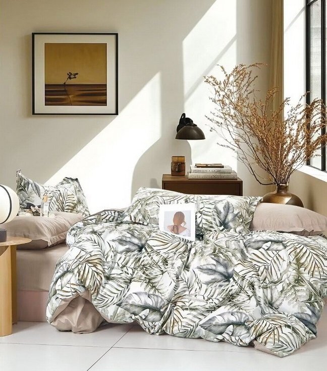 Комплект постельного белья «Павлайн Органик Тропики» (2,0-спальный, сатин) оформлен ярким и свежим принтом с крупными тропическими листьями в зелёно-бежевой гамме, создаёт атмосферу уюта и расслабленности. Включает пододеяльник, простыню и наволочки, выполнен из качественного сатина — материала, отличающегося долговечностью, гипоаллергенностью, отличной воздухопроницаемостью и приятной на ощупь текстурой. Идеально подойдёт для стильного оформления спальни и комфортного сна.