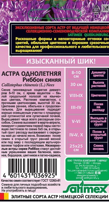 - Семена Астра Риббон синяя пионовидная 0,1г