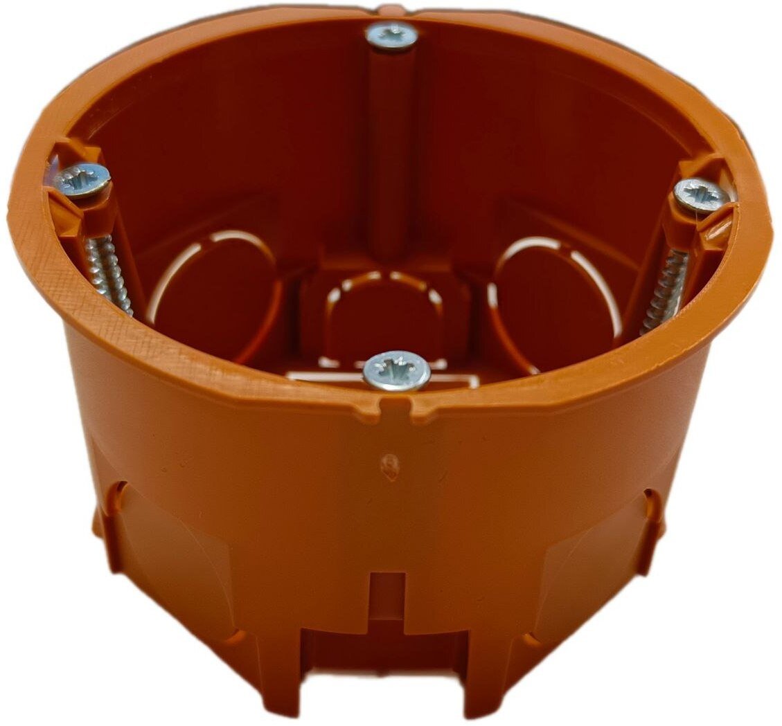 Не требует приготовления раствора или гипса. Монтаж занимает минуты: необходимо вырезать отверстие соответствующего диаметра в ГКЛ, вставить коробку и затянуть винты распорных лапок. Идеально для ремонтных и отделочных работ.