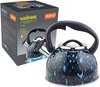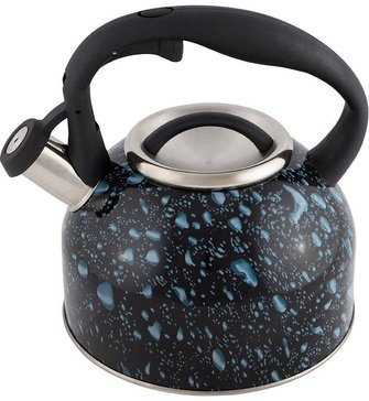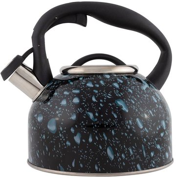 Чайник серии Lacrima выполнен из высококачественной нержавеющей стали, внутри матовый, снаружи окрашен в черный цвет с синими каплями. Носик чайника оснащен насадкой-свистком, что позволит контролировать процесс подогрева или кипячения воды. Чайник снабжен стальной крышкой и эргономичной нейлоновой ручкой. Подходит для всех видов плит.