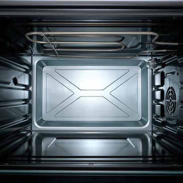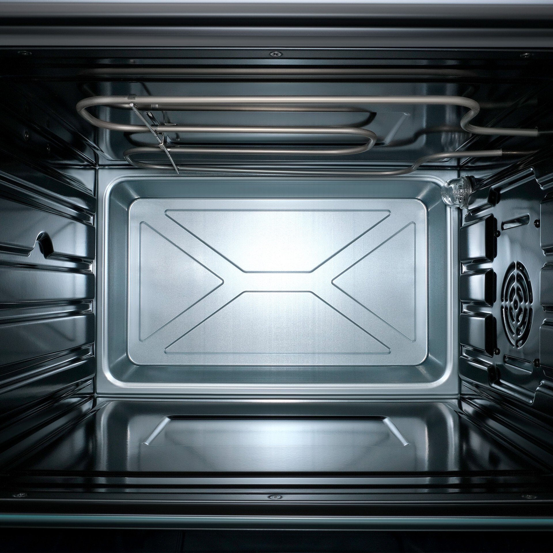 Для большой семьи и шумных компаний. Эта мини-печь с расширенным объемом вмещает два противня одновременно или индейку до 5 кг. Модель с индексом B2 — усиленная версия: увеличенная высота камеры позволяет готовить в высокой посуде, например, в чугунном казане или форме для кекса. Черный матовый корпус не бликует и выглядит строго.